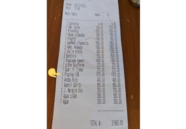 Fuente: “Si pasa, pasa”: fue a comer y en el ticket camuflaron un cobro extra. Por Mía FM.
